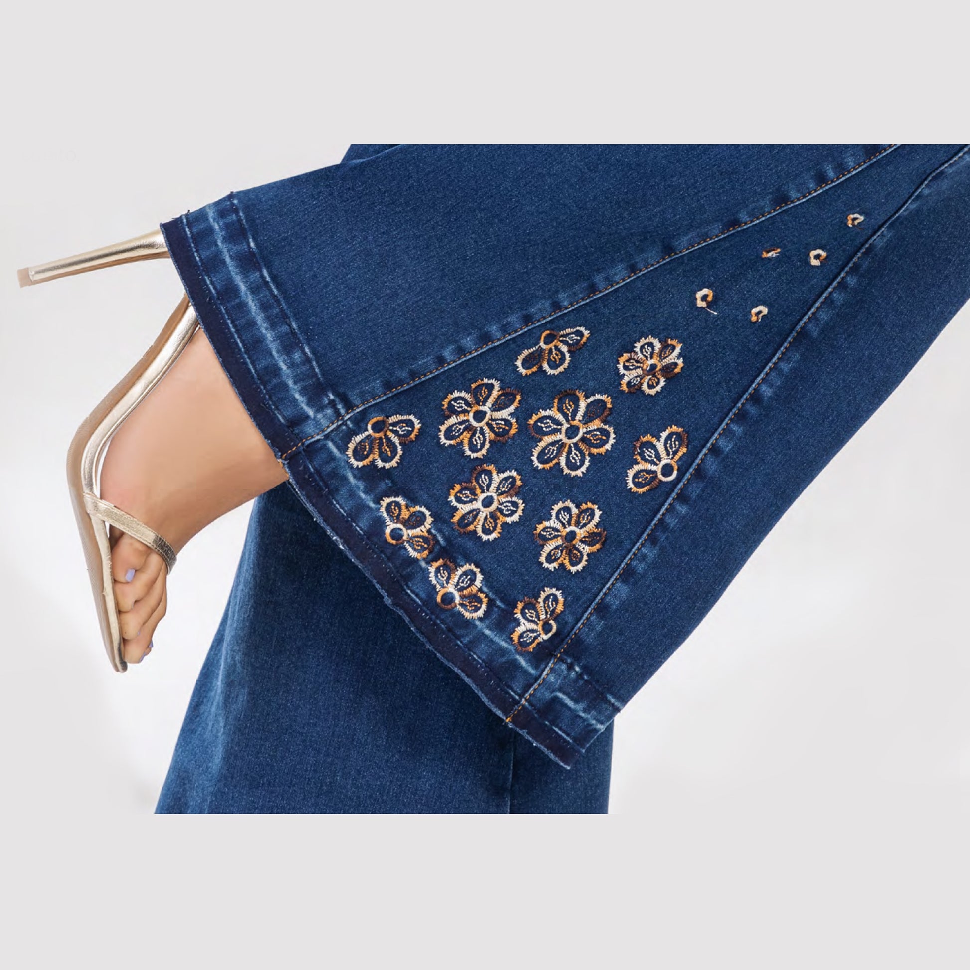 • Leg Cut: Extra flared leg with a loose hem and floral embroidery, adding a feminine touch.