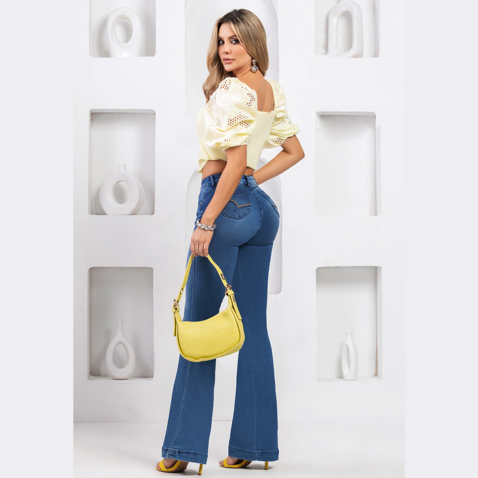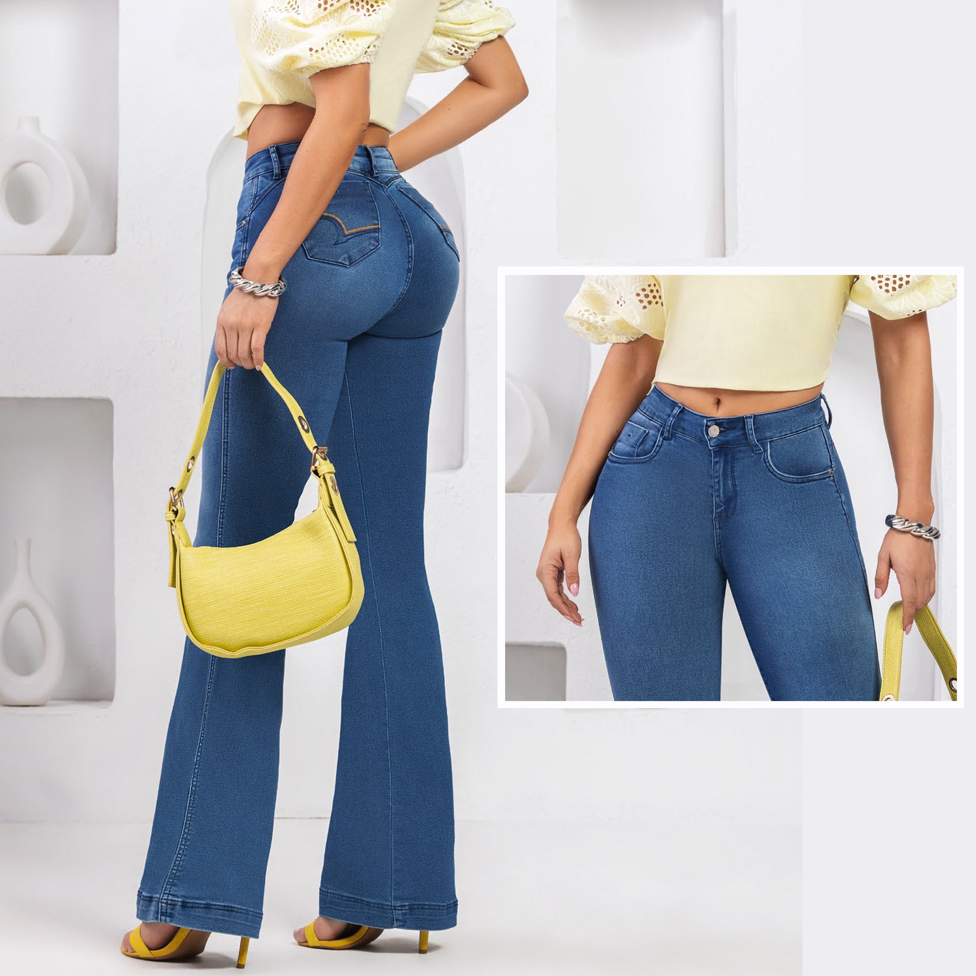 This push-up jean blends comfort and elegance with its satin finish. The bell-bottom style elongates the figure, perfect for pairing with heels or boots, ensuring a sophisticated look ideal for brunch with friends.