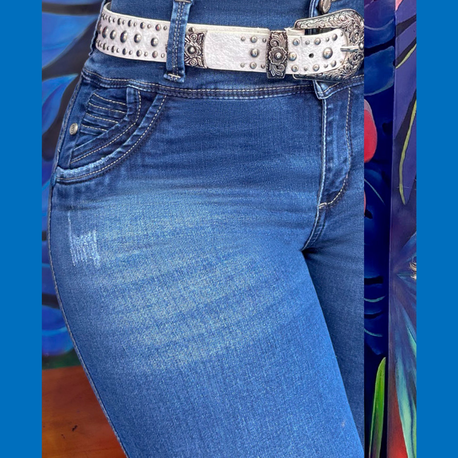 This jean combines style and structure in a unique design. The push-up effect enhances your figure, while the lack of pockets creates a sleek, modern finish. It also includes a cowboy belt, adding a touch of authenticity.