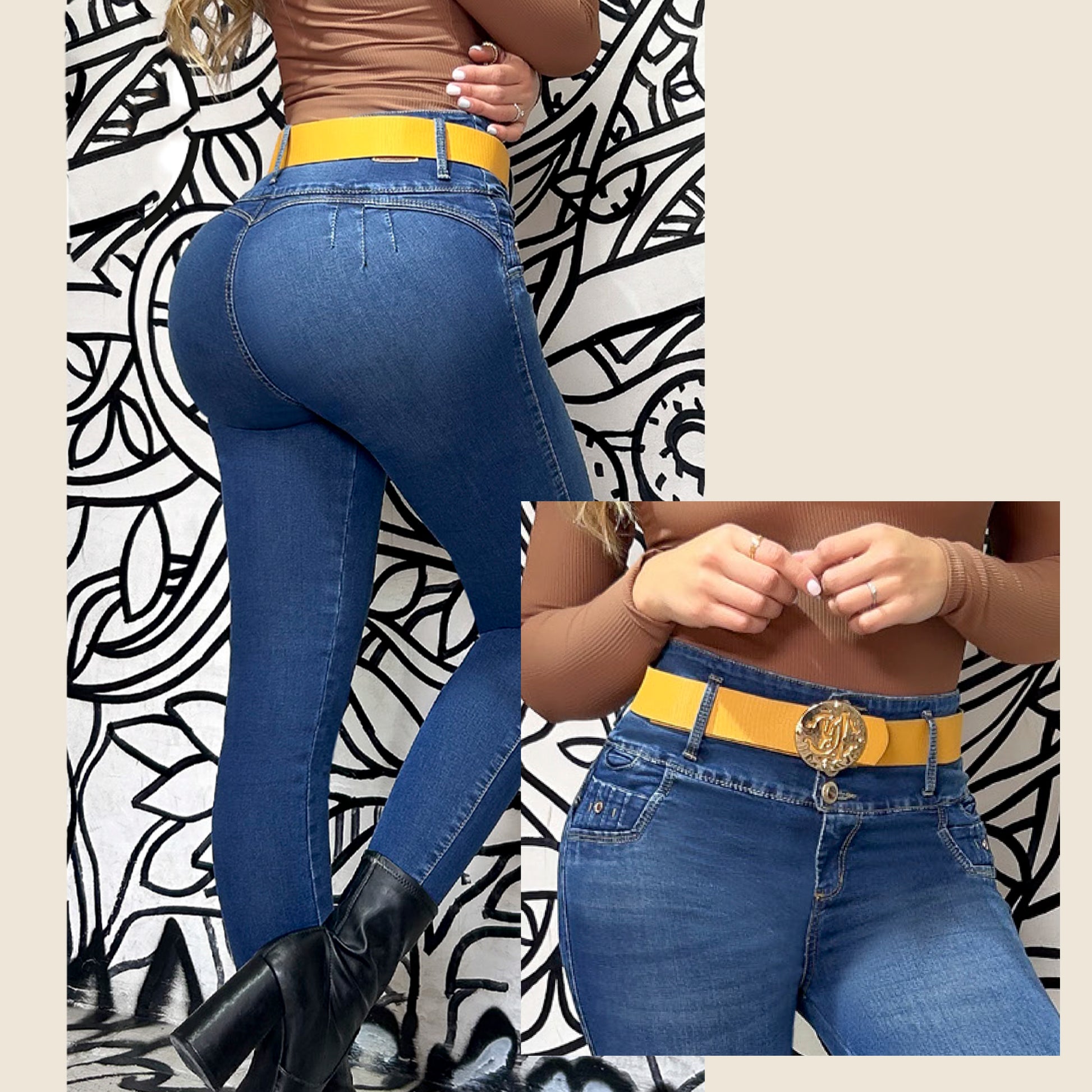 Este jean no solo resalta tu silueta, sino que también ofrece soporte adicional gracias a su faja interna tipo calzón. Además, incluye una correa para complementar tu look con un toque sofisticado.