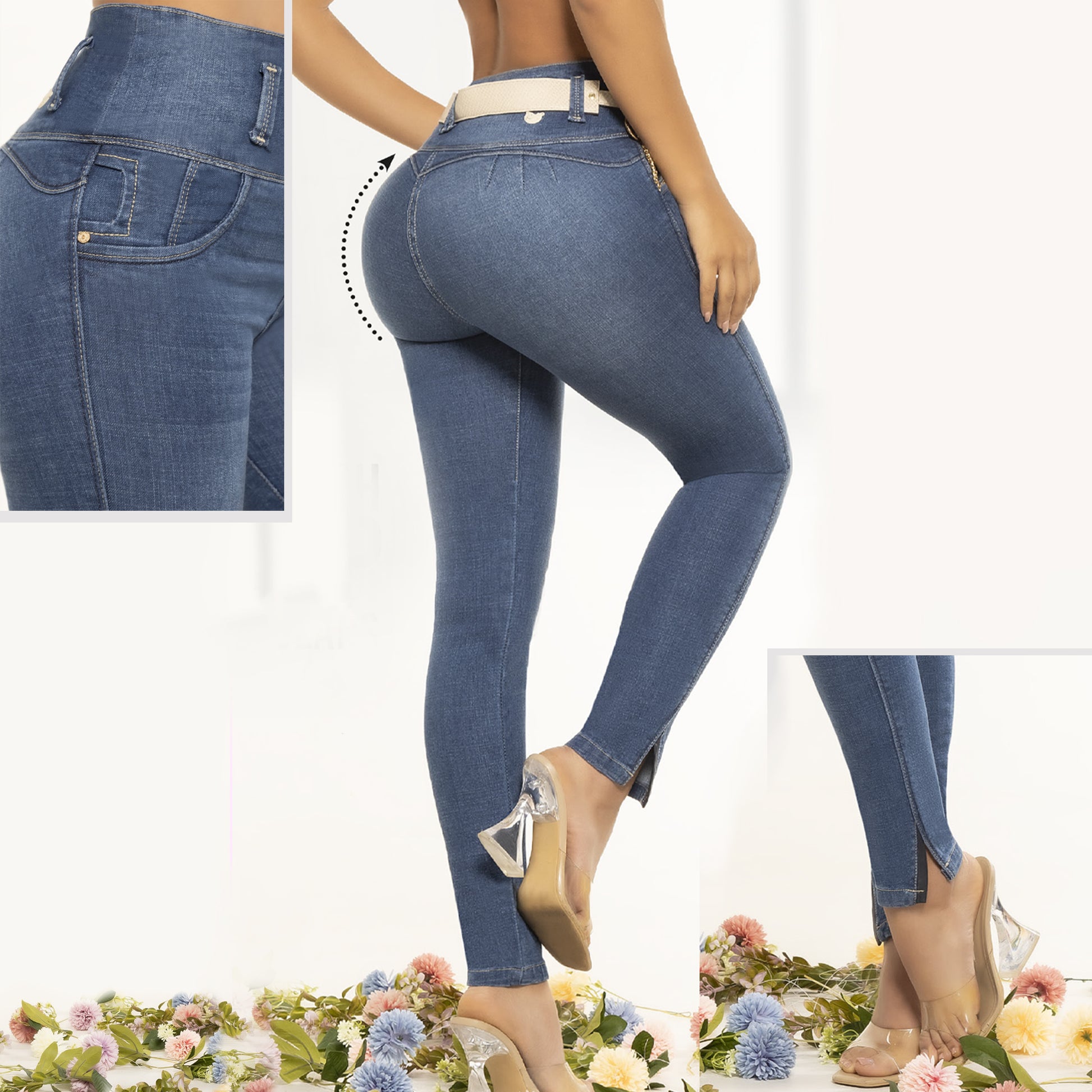 This high-waisted jean with four buttons offers a perfect, flattering fit. The skinny leg with a unique design accentuates your figure, while the included belt adds an extra touch of style. Perfect for a modern, chic look suitable for any occasion.