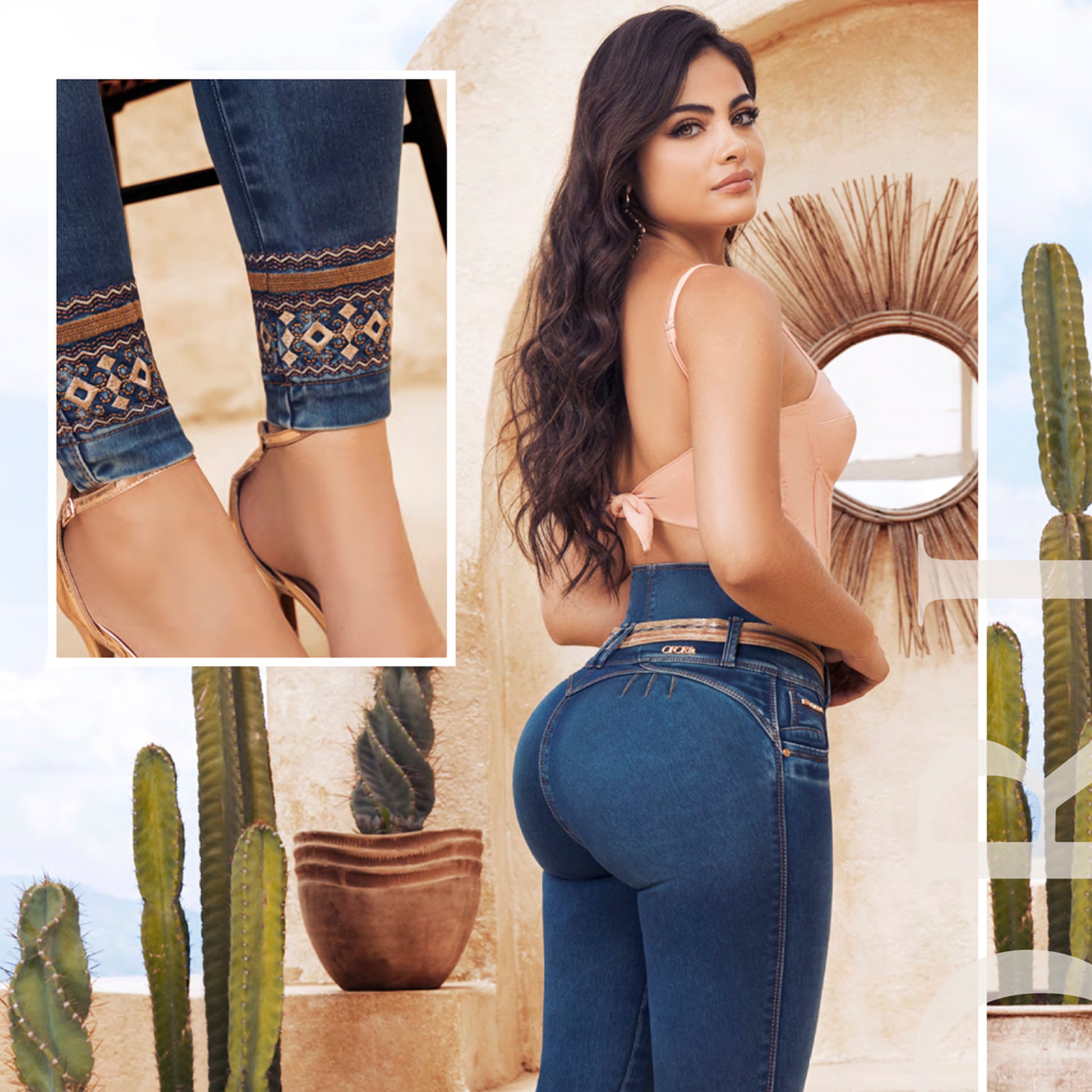 Este jean destaca por su exclusivo acabado de efecto piel de durazno y una pretina de tiro alto garantizan un ajuste elegante. La bota tubo, adornada con un delicado detalle bordado, aporta un toque distintivo.