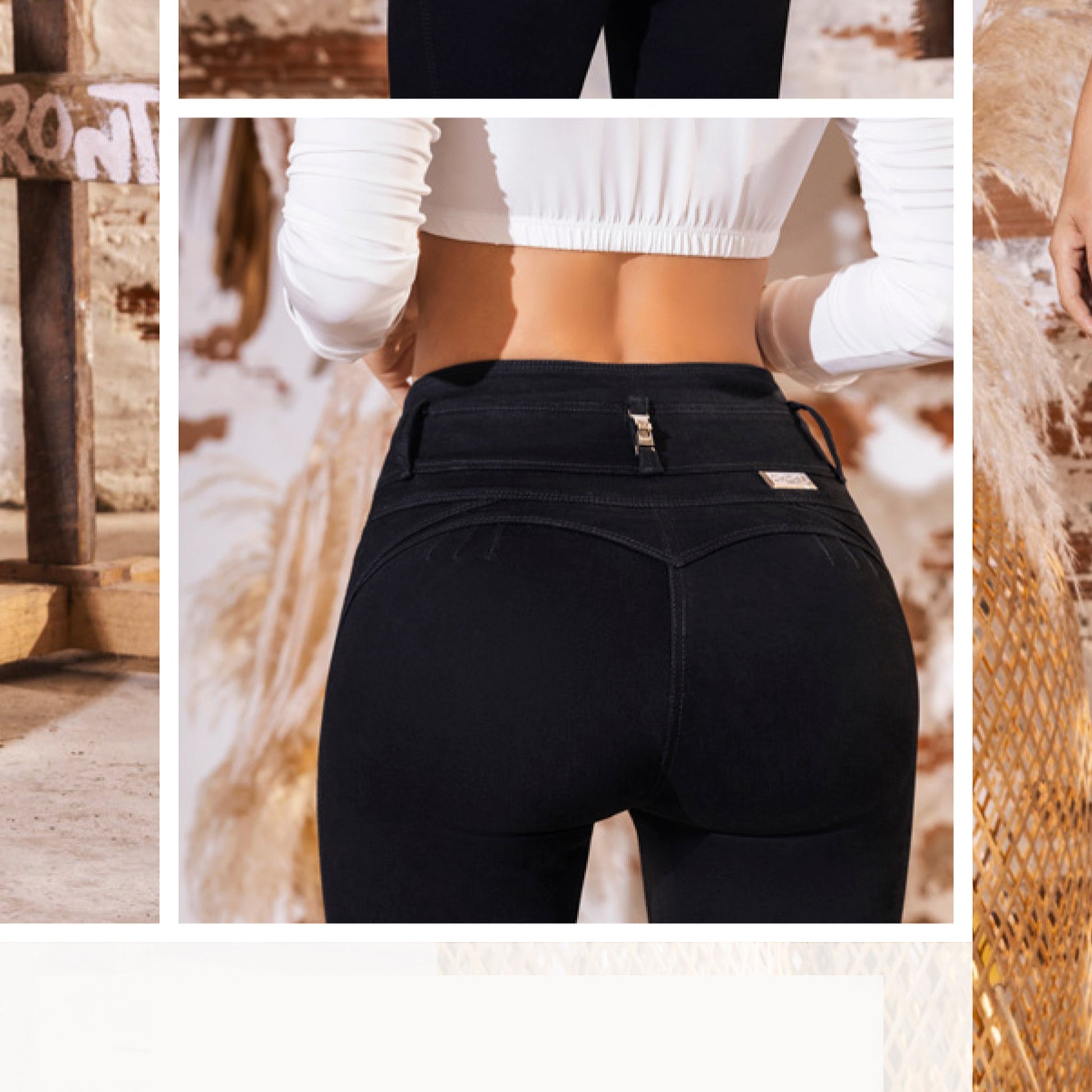 This pair of jeans is the perfect blend of comfort and modern style. Its pocketless design enhances the push-up effect, beautifully shaping your figure. The decorative zipper adds a bold and sophisticated touch, while the faded blue wash finish gives it a fresh and versatile look.
