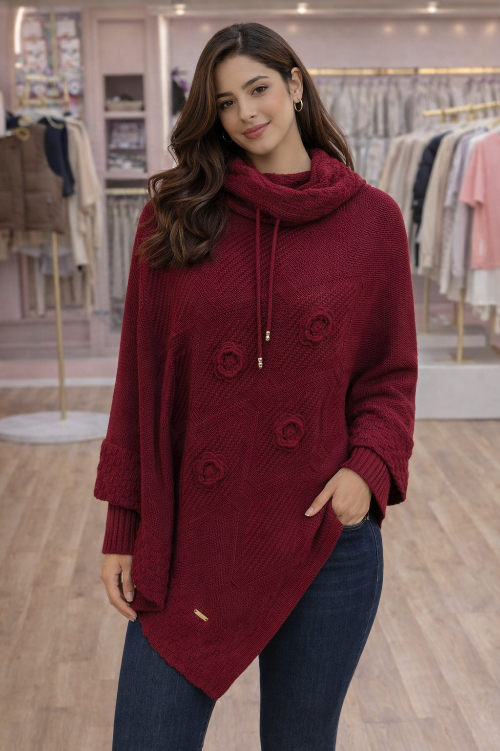 Elevate your everyday look with this elegant red knit ruana sweater. Designed with a cozy turtleneck, soft textured fabric, and a flattering asymmetrical hem that drapes beautifully on the body. Its relaxed fit makes it easy to style while still feeling feminine and chic. Perfect for casual outings, brunch dates, or dressing up with your favorite jeans or leggings.