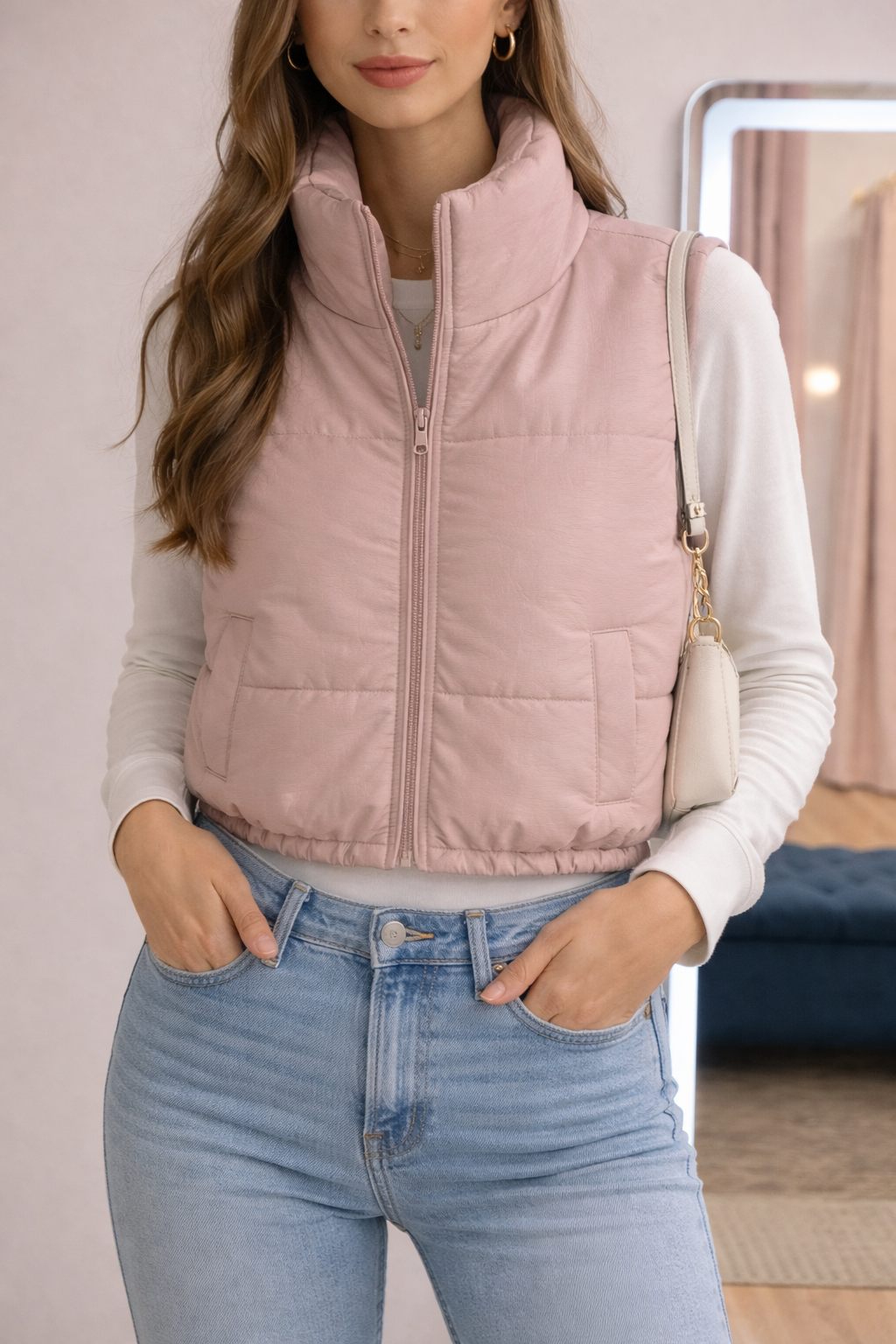 This stylish padded vest is designed to keep you warm without feeling heavy. The soft, insulated interior provides cozy warmth, while the lightweight construction allows for comfortable, all-day wear. Featuring two functional front pockets and an elasticized bottom hem, it offers a flattering fit that stretches and moves with your body. Perfect for layering over sweaters or long sleeves, this vest combines comfort, warmth, and effortless style.
